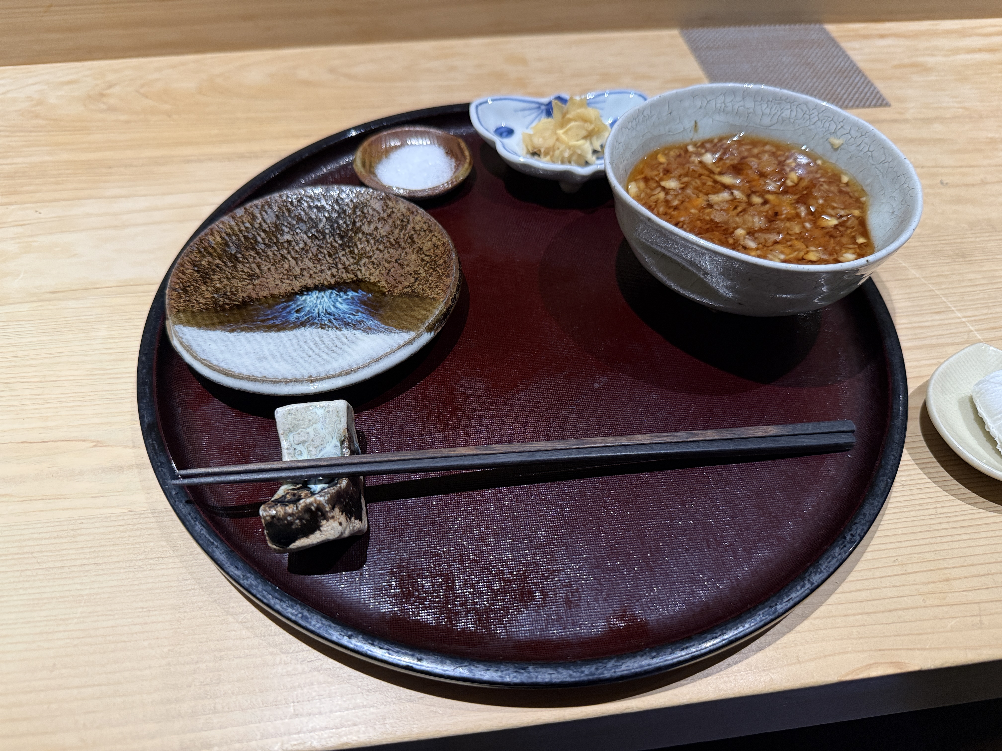 자리에는 소금과 가리(초생강), 덴다시(튀김 찍어먹는 안 짠 간장)이 셋팅되어 있다.